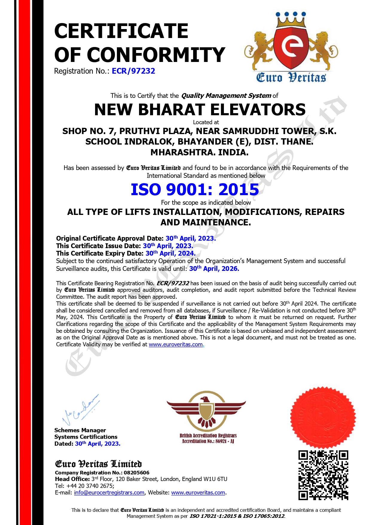 Certificates New Bharat Elevator Certificates and Documentations ISO 9001-2015 Indian (2019) BSB Elevator Certificates and Documentations